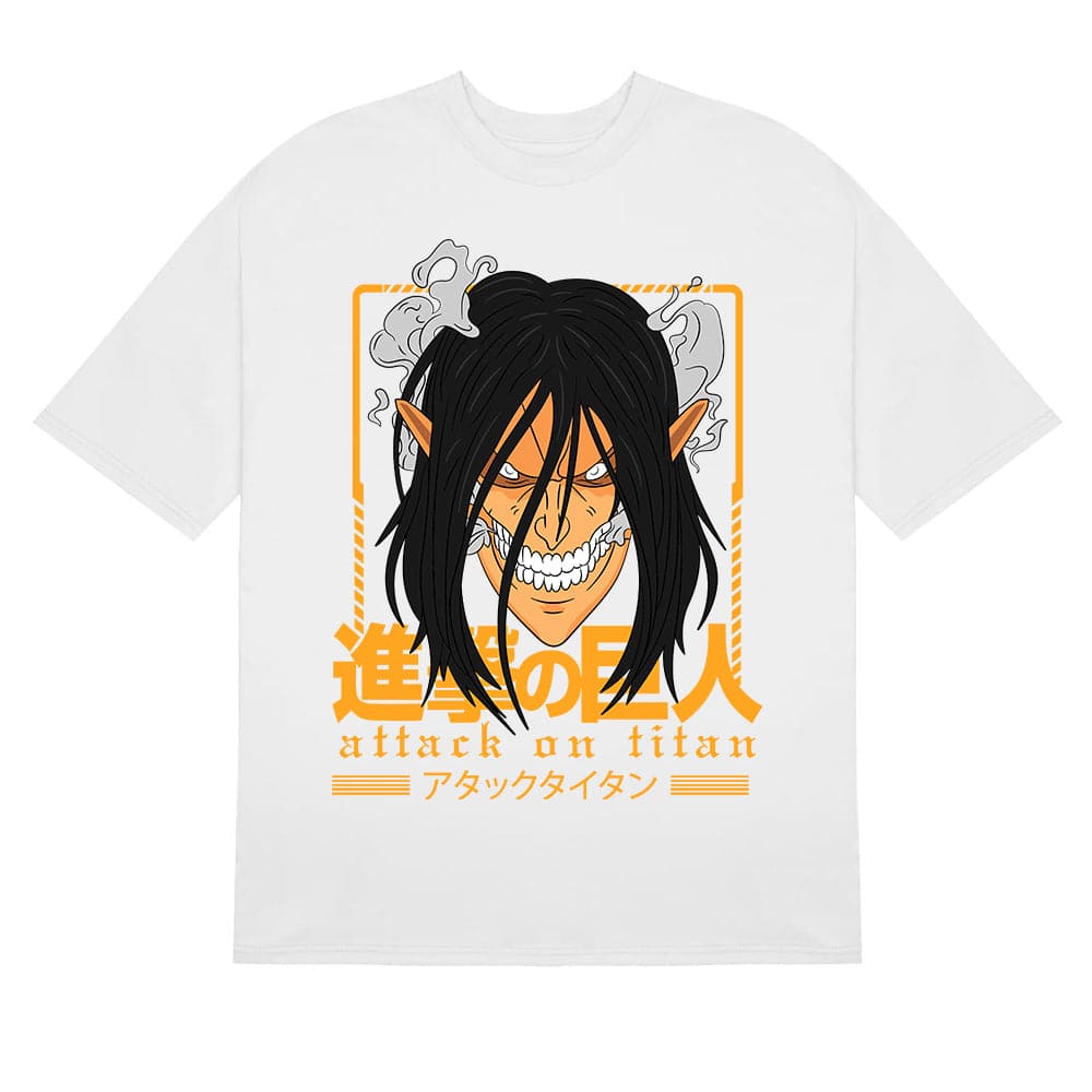 Unleash the ferocity of the Attack Titan with this Eren Yeager T-Shirt from Attack on Titan. Featuring a striking design of Eren Yeager's Titan form, this white tee captures the raw power and intensity of one of the series' most iconic transformations. The Japanese text and Attack on Titan logo add an authentic touch, making it an essential piece for any fan's collection. Made from high-quality 250g pure cotton, this T-shirt offers exceptional comfort and durability, perfect for both casual wear and anime conventions.