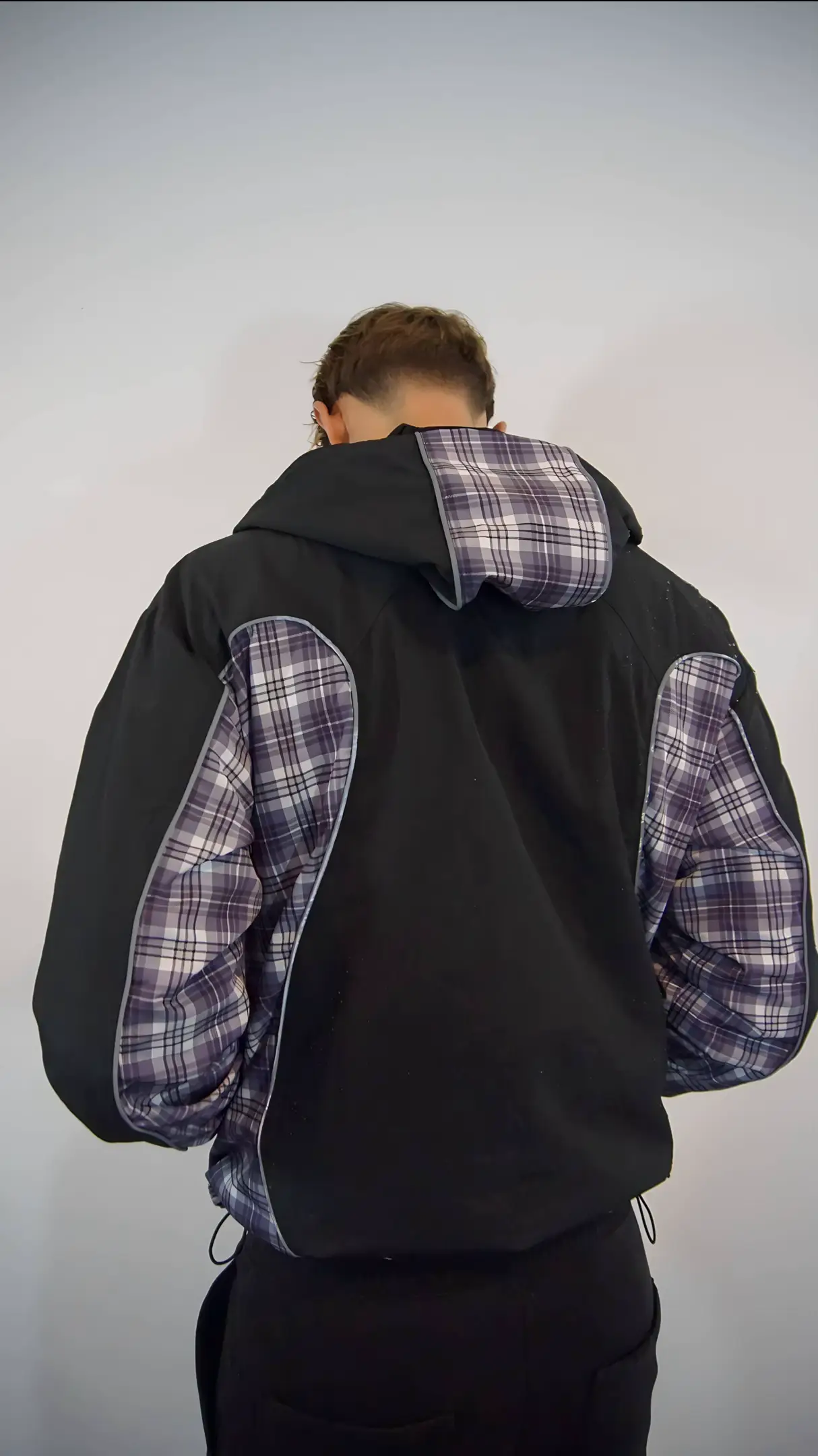 - Contrast plaid panels along the sleeves and sides for a layered street look