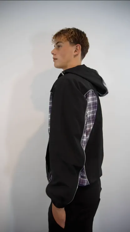 Stand out in the streets with this bold contrast-panel jacket. Built for everyday wear with a mix of street-ready attitude and comfort, it combines a clean black shell with plaid inserts for a unique edge.