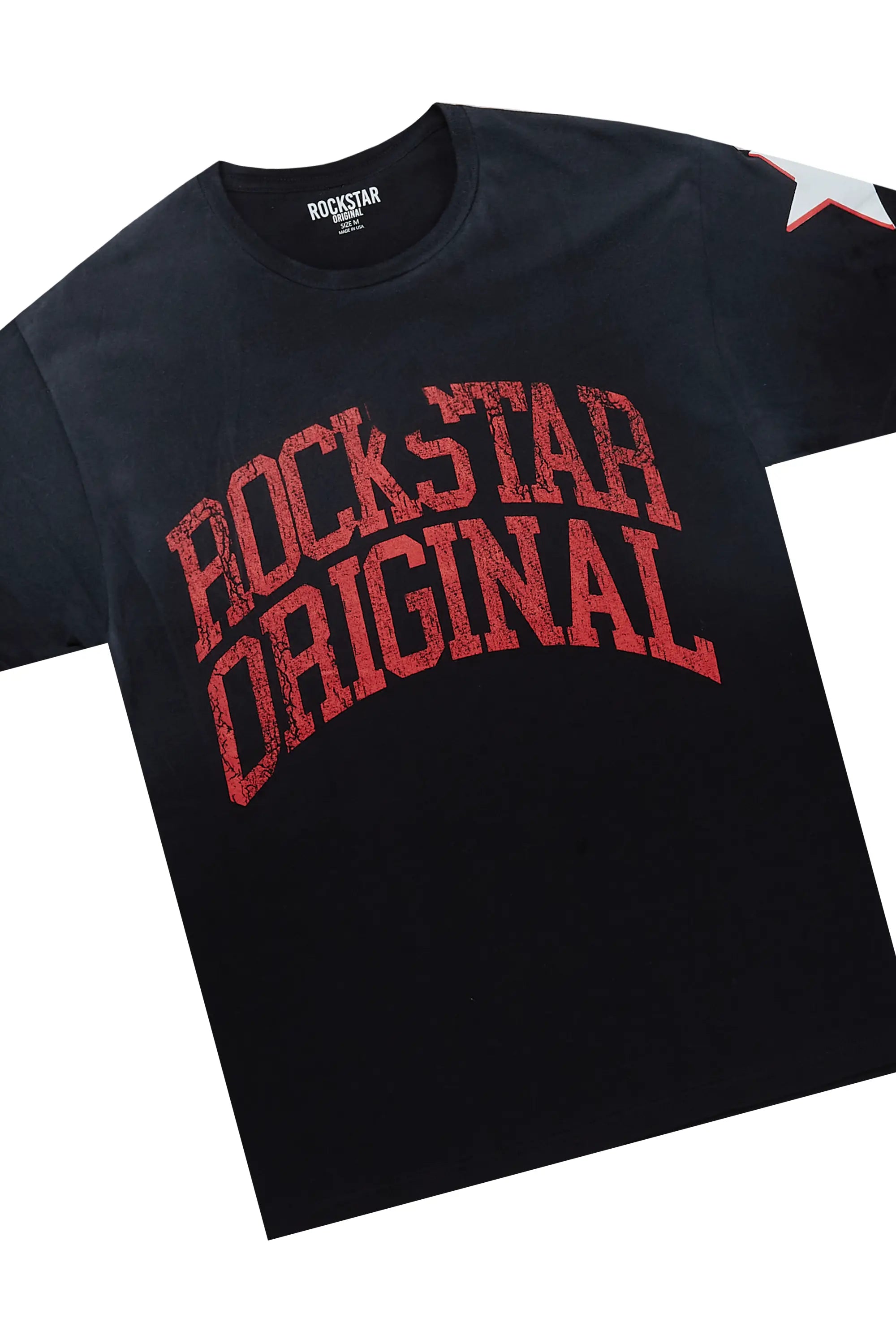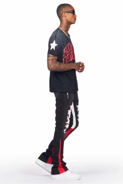 An urban two-piece stack flare tee and pant set for men in black. Designed with extra long legs and custom detailing for a dope streetwear set.