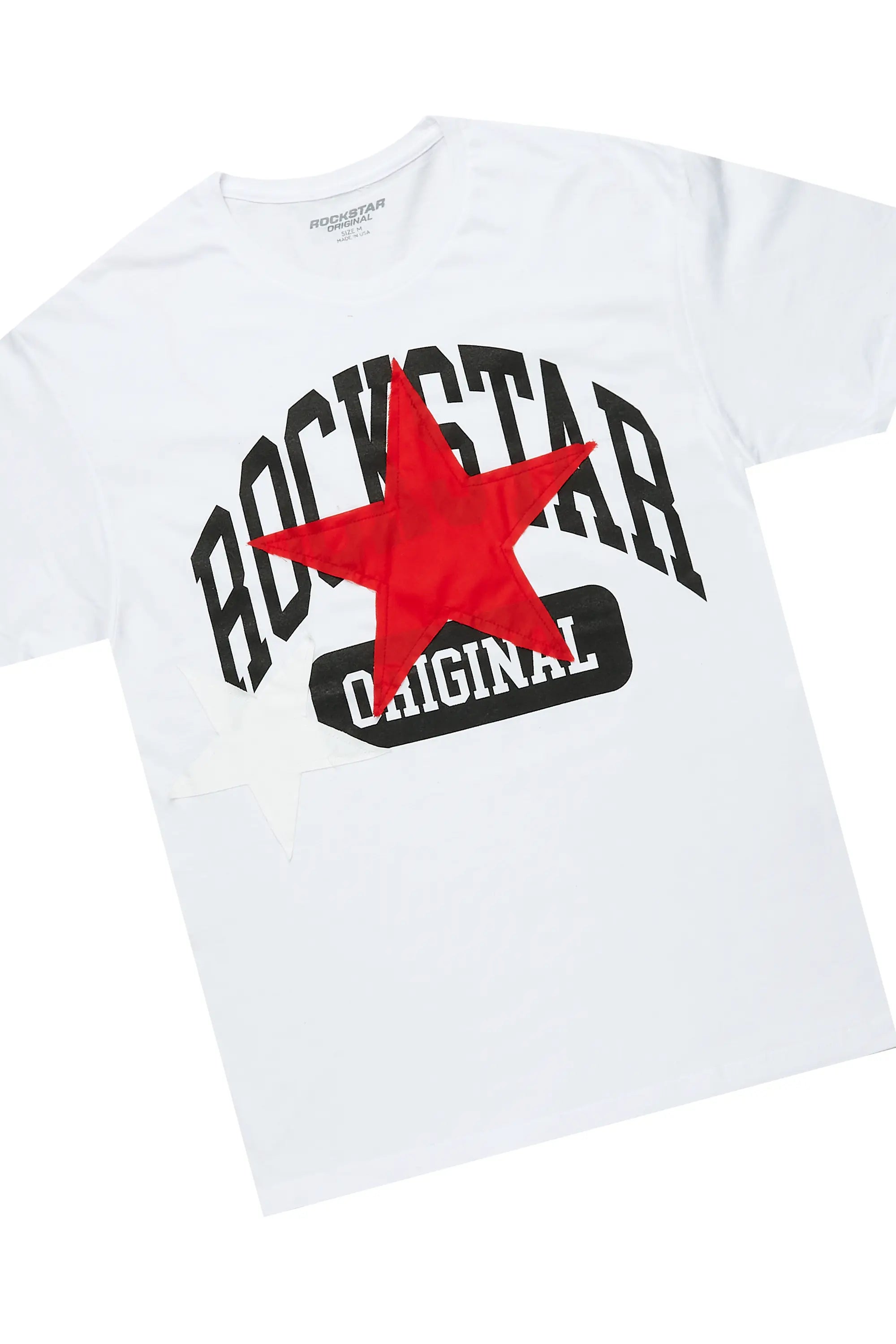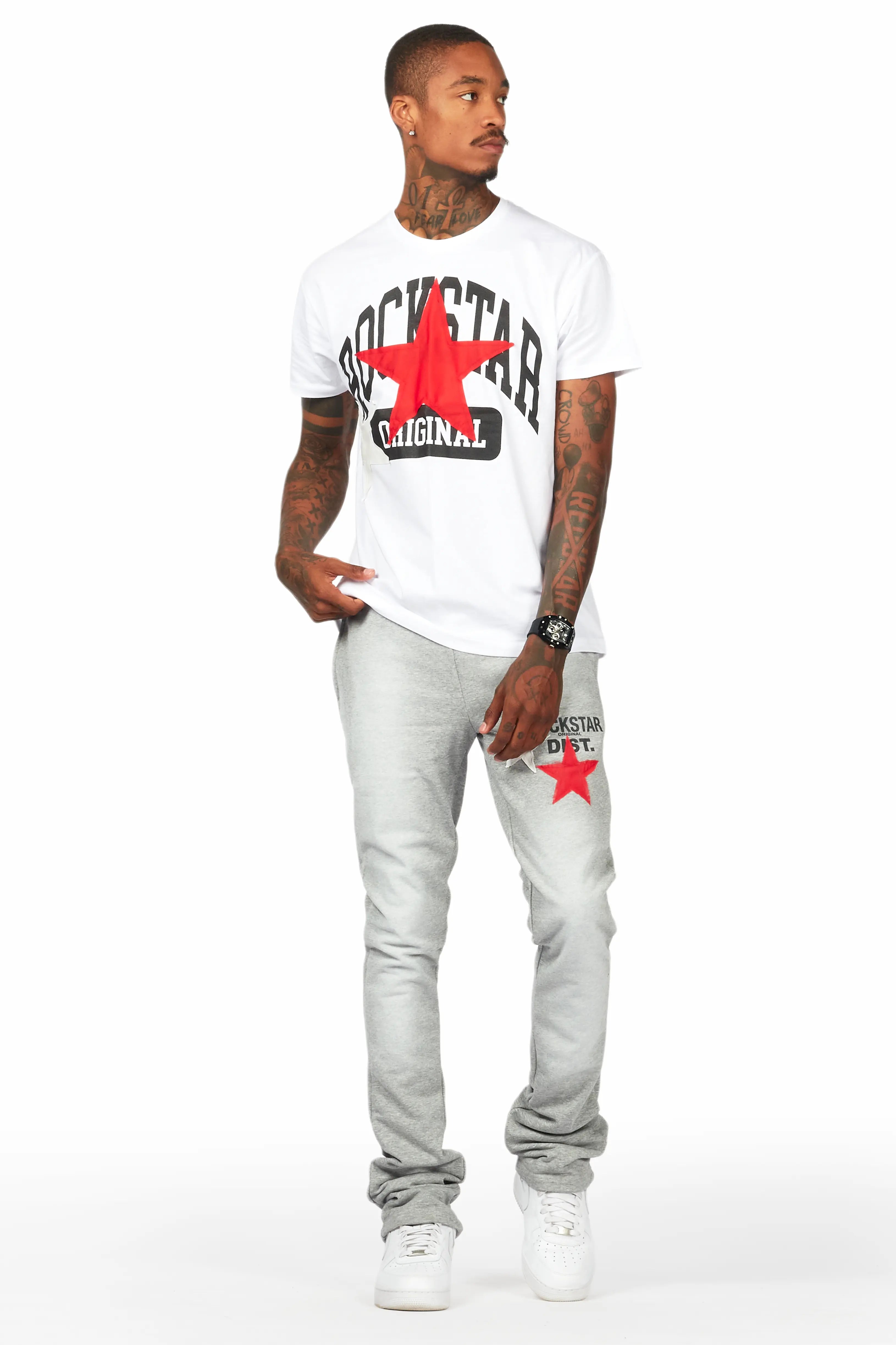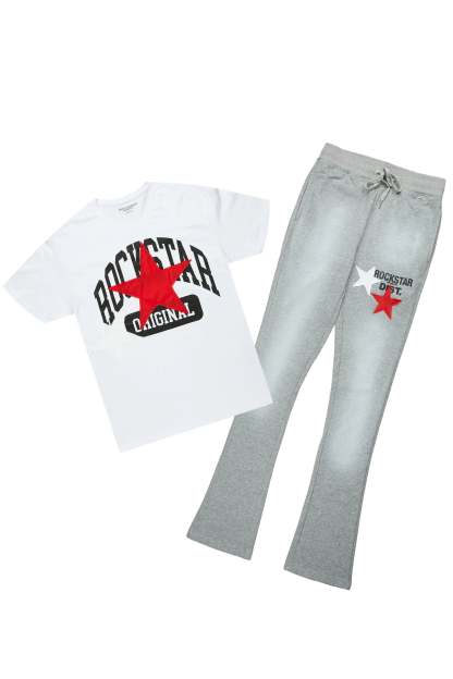 An urban two-piece t-shirt and stacked pant tracksuit set for men in grey. Designed with ultra soft fabric and extra long legs for a dope streetwear set.