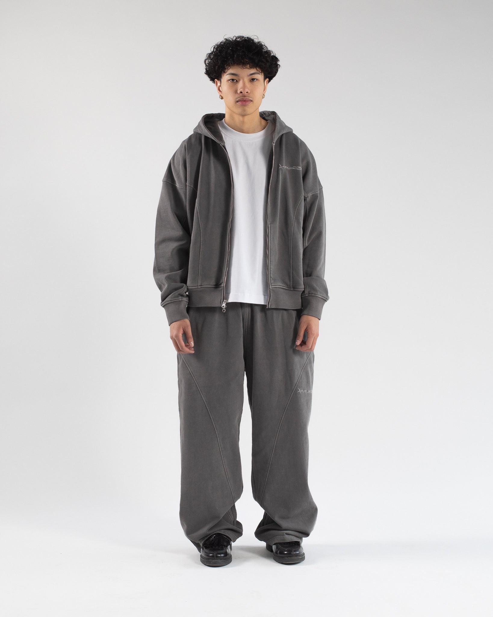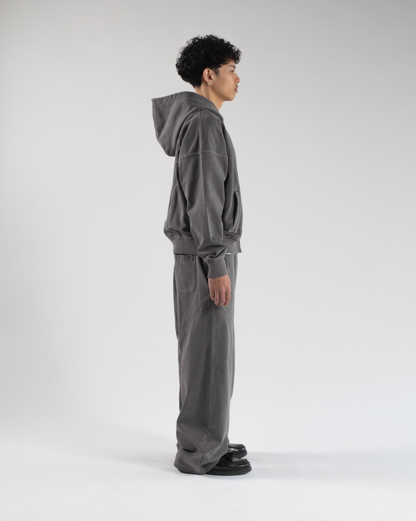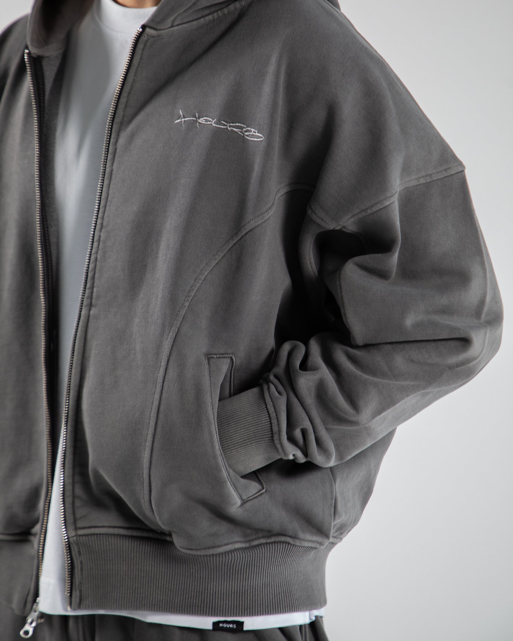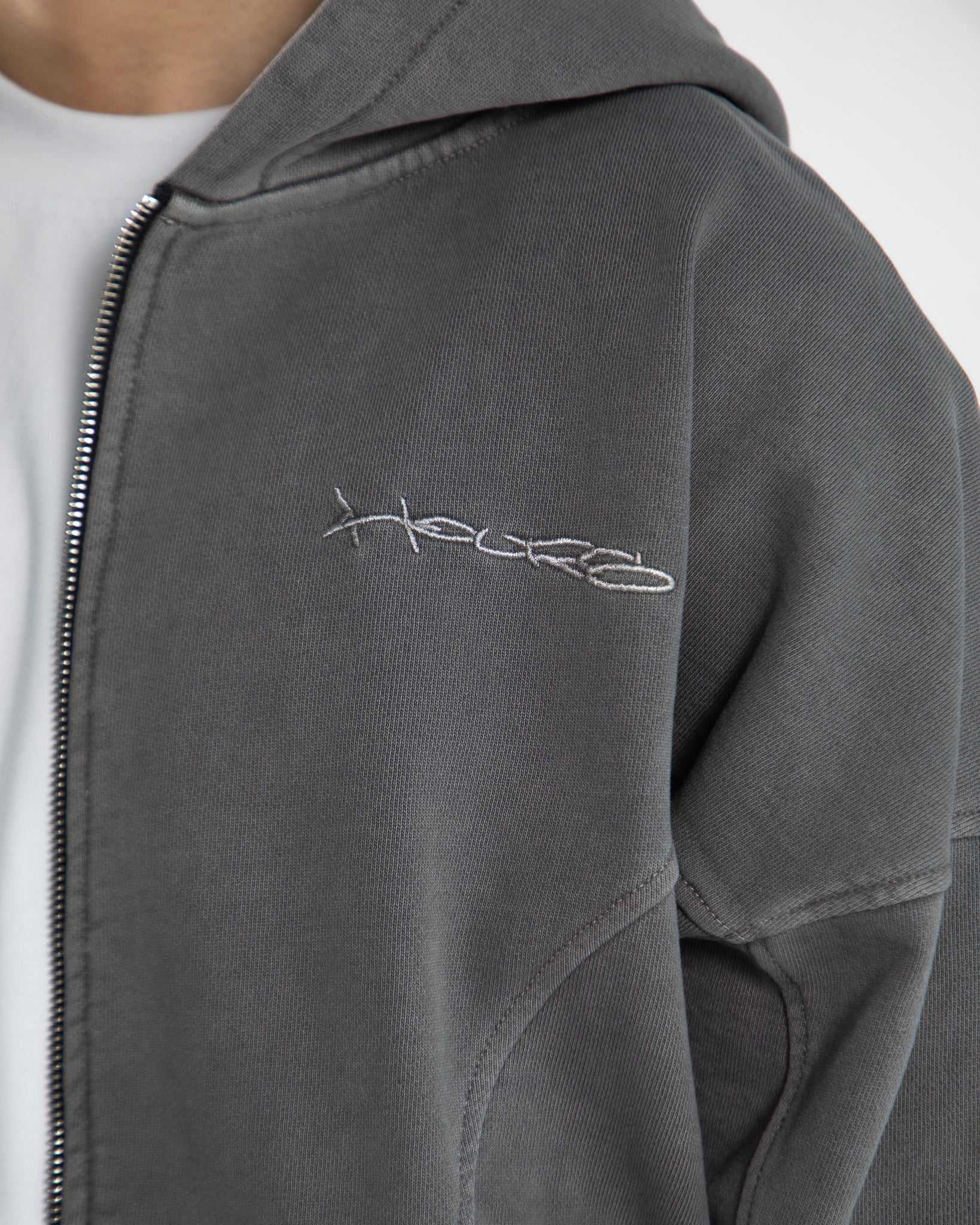 Crafted from our premium 450 GSM 100% cotton French terry, the Signature Zip Hoodie refines our core silhouette with elevated details. It features the same relaxed fit with drop shoulders, a double-zip closure, and adds welted side pockets. Thoughtfully placed panel seams enhance structure, while dyed script embroidery adds a branded touch. A specialized mineral stone wash gives each piece a unique vintage character.