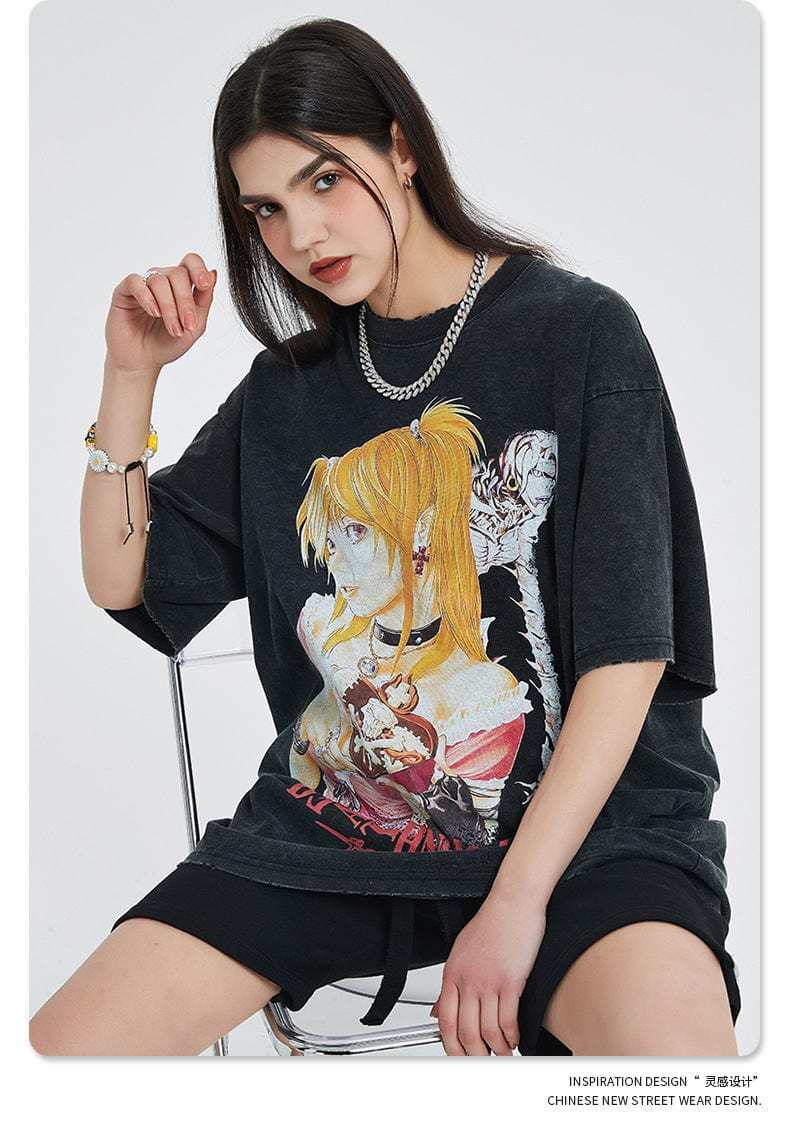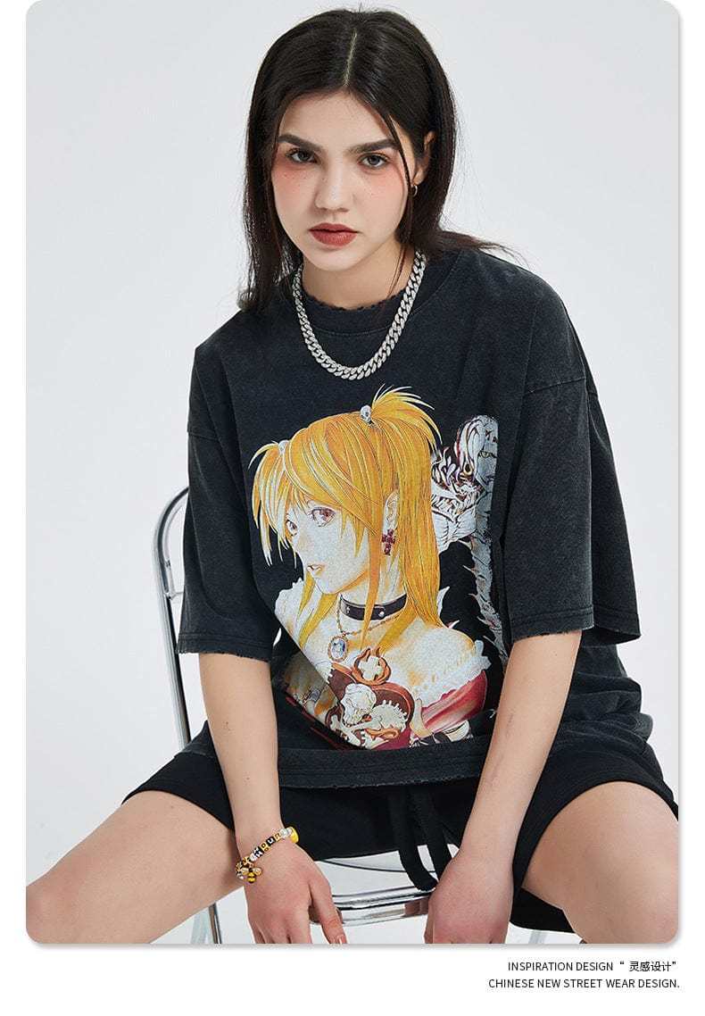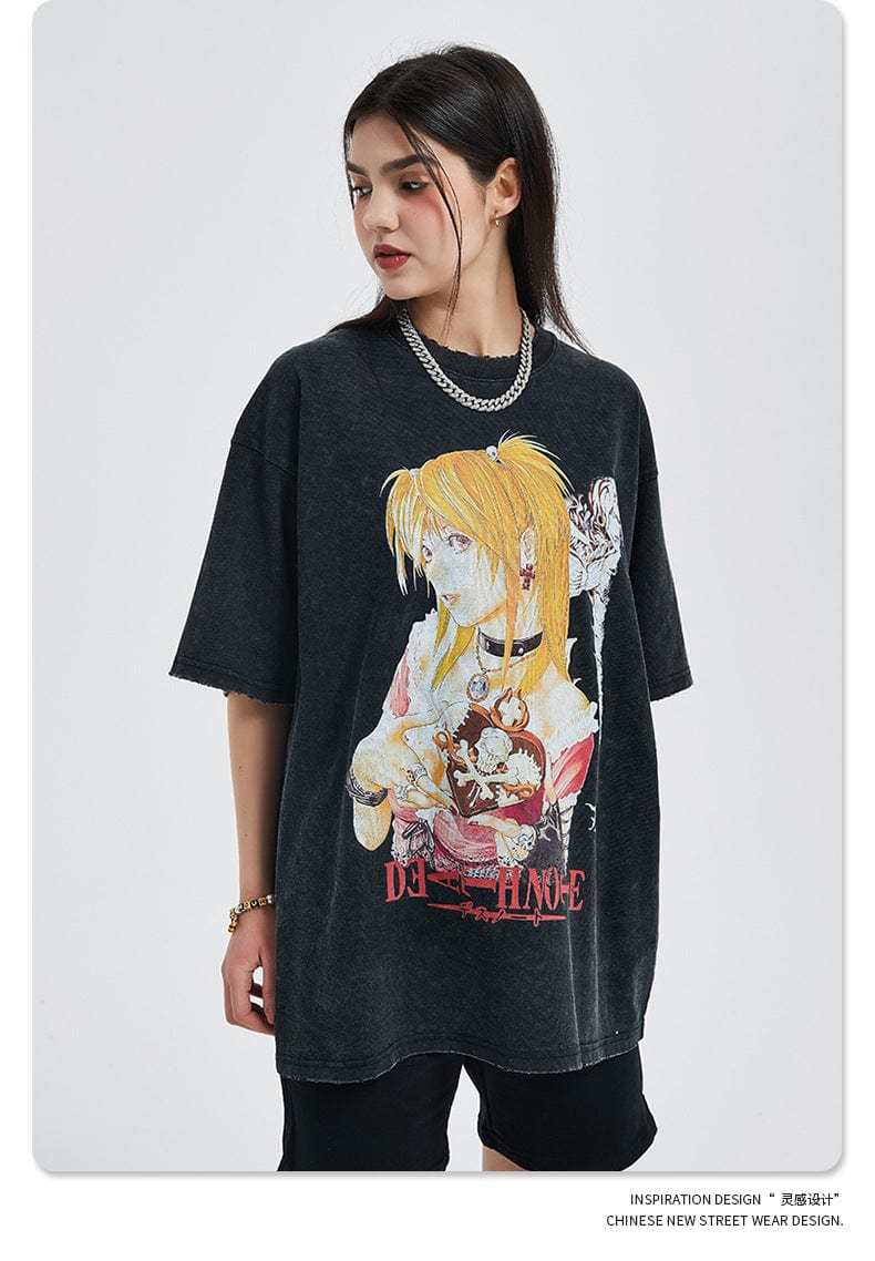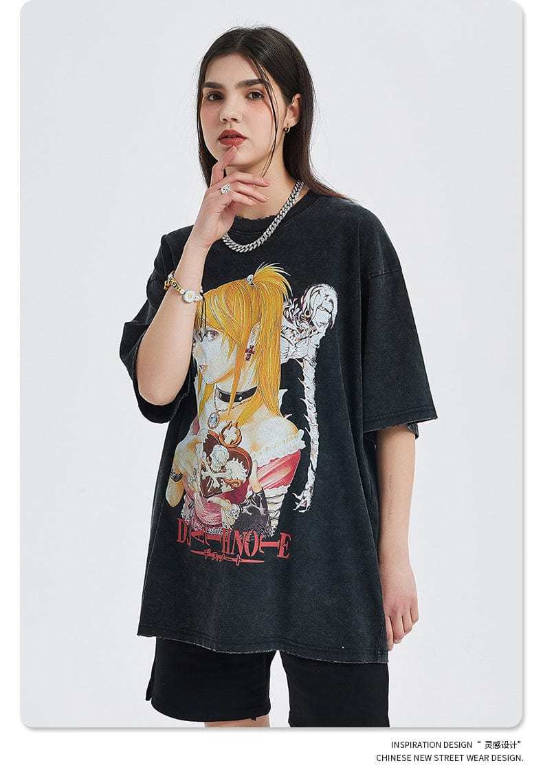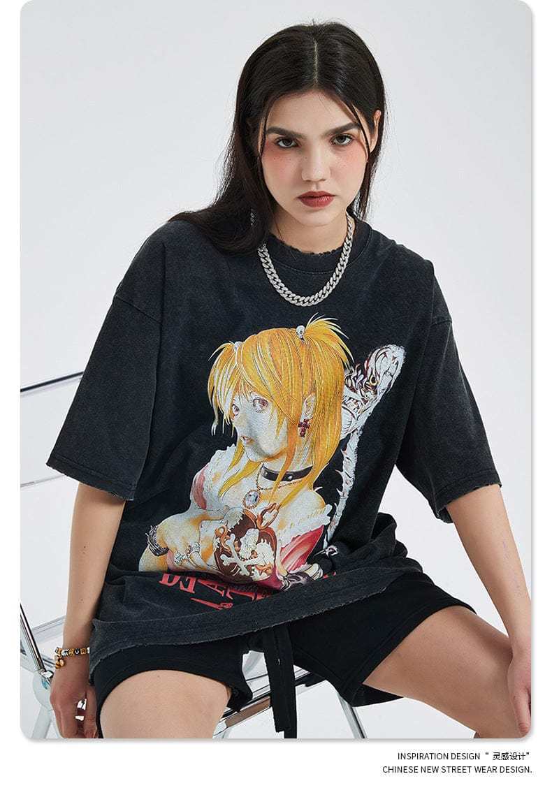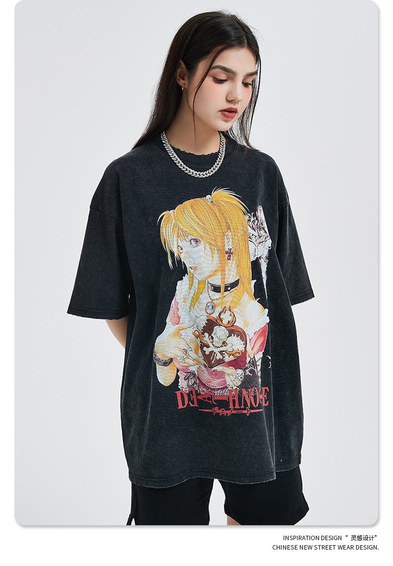 Show your admiration for the iconic anime series with our exclusive "Vintage Death Note T-Shirt." This stylish vintage anime apparel features high-quality, vibrant illustrations of Misa Amane from the classic Death Note series, capturing its dark and mysterious atmosphere. Made from premium cotton with a weight of 250gsm, this t-shirt ensures excellent comfort and breathability. The relaxed fit and distressed design make it perfect for casual outings or anime conventions, appealing to dedicated fans of the series. The print is treated to prevent pilling and fading, ensuring long-lasting durability. Whether you're wearing it for everyday comfort or to showcase your anime passion, this t-shirt is a must-have for any Death Note fan.
